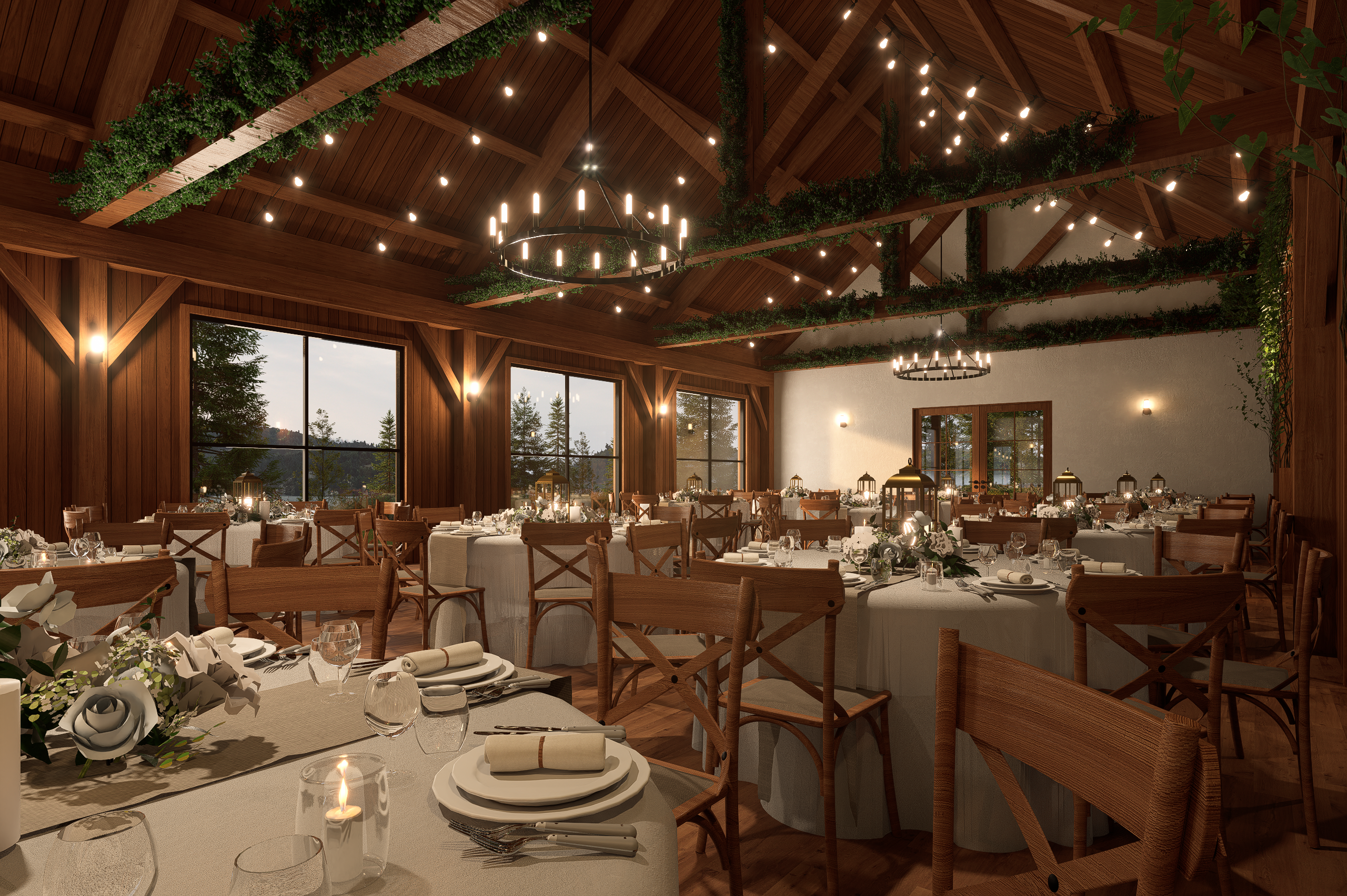 Inside, exposed wooden beams, wide-open space, and glowing string lights set the scene for unforgettable nights. There’s plenty of room for live bands or DJs, a spacious dance floor ready for a crowd, and flexible layouts for everything from long farmhouse tables to cocktail-style mingling. Large windows frame mountain views and barn doors open to a large patio and lawn, blending indoor comfort with outdoor adventure. Step outside and you’ll find fire pits crackling, room for lawn games, and endless photo ops with rugged peaks as your backdrop. It’s private, yet close to town, and built for making memories that last long after the last song plays. Whether you’re planning a wedding weekend, birthday blowout, reunion, or just a reason to gather your favorite people, Vale Barn is where laid-back vibes, big celebrations, and breathtaking scenery come together.